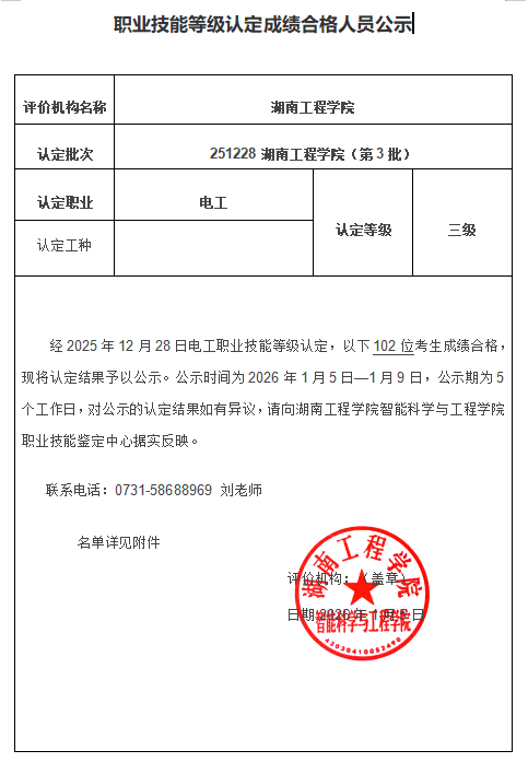 2025年12月28日职业技能等级认定成绩合格人员公示