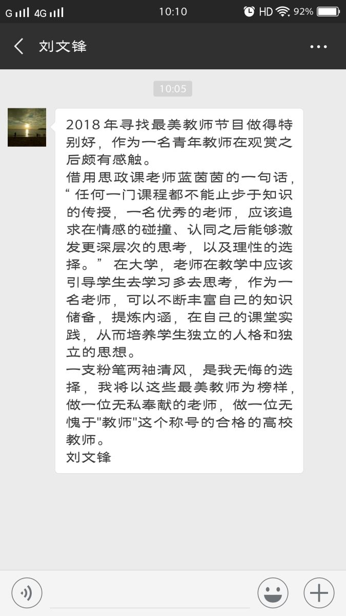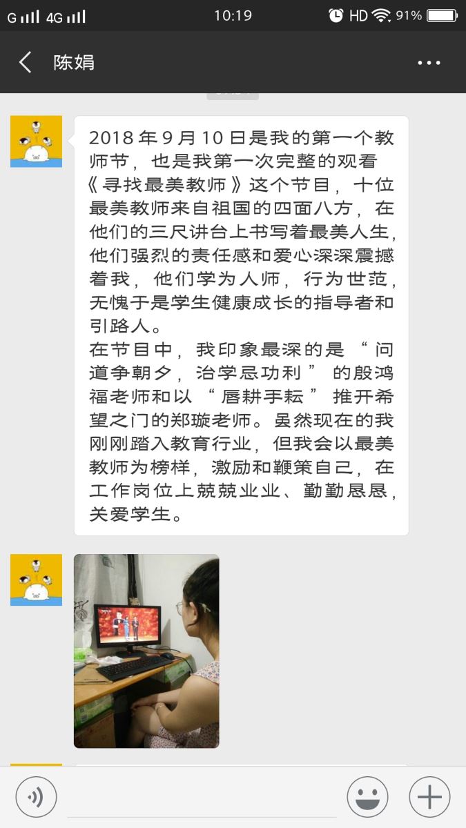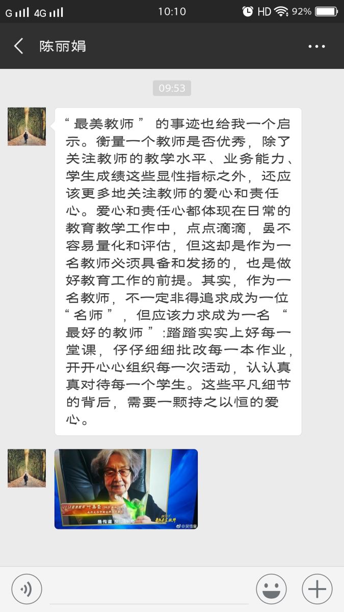 节目观看完毕,大家纷纷发来观后感,表示要以这些最美教师作为自己在工作中的榜样,树立强烈的责任心和事业心,把工作当作一种事业的追求,满腔热情的、全身心的投入各项工作,肩负起教书育人的重担,力争做“有理想信念、有道德情操、有扎实知识、有仁爱之心”的“四有”老师,当好学生健康成长的指导者和引路人。