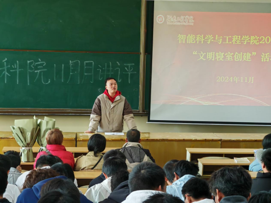 11月28日中午,英国上市公司365在第一教学楼213教室举办11月份月讲评和文明寝室创建活动,学院党委副书记杨文奎、南校区宿管站负责人刘泽宇、学院学工办周岳崇、学生公寓负责人与学院全体学生参加本次活动。