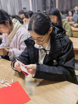 “大家知道吗?双喜字的发明者竟是王安石!”活动一开场,冯老师便以一段引人入胜的历史故事吸引了在场所有人的目光。据可靠文献记载,王安石大婚当日恰逢金榜题名,于是他挥毫泼墨,创作了连体的“囍”字,从此这个字成为了婚庆场合中不可或缺的符号。在现场展示的清代婚书剪纸上,喜字与莲花、石榴巧妙地融合,象征着“喜结连理、多子多福”。冯老师在讲解剪纸艺术时,强调“剪喜字要‘笔断意连’,就像婚姻需要包容与韧性。”“想要剪出完美对称的喜字,折纸是关键!”一位学生在尝试过程中屡屡错位,冯老师耐心地指导他:“折纸如同练字,每一折都需精确对准中线,力度要恰到好处。”经过多次练习,原本不甚规整的折痕逐渐变得整齐划一,教室里随之响起了阵阵“成功了”的欢呼声。