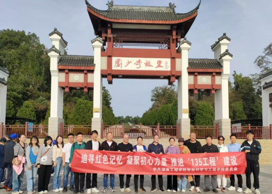 刘少奇同志纪念馆坐落在湖南省宁乡县花明楼镇,从刘少奇故里牌门入园,穿过门楼广场,映入眼帘的是高7.1米的刘少奇铜像,这个高度有两层含义:第一,“七一”是党的生日,刘少奇同志一生都奉献于党和人民的事业;第二,刘少奇同志享年71岁。在铜像前,由院党委书记赵中华作为领誓人,学院全体党员同志在党旗下重温入党誓词,进行庄严宣誓。