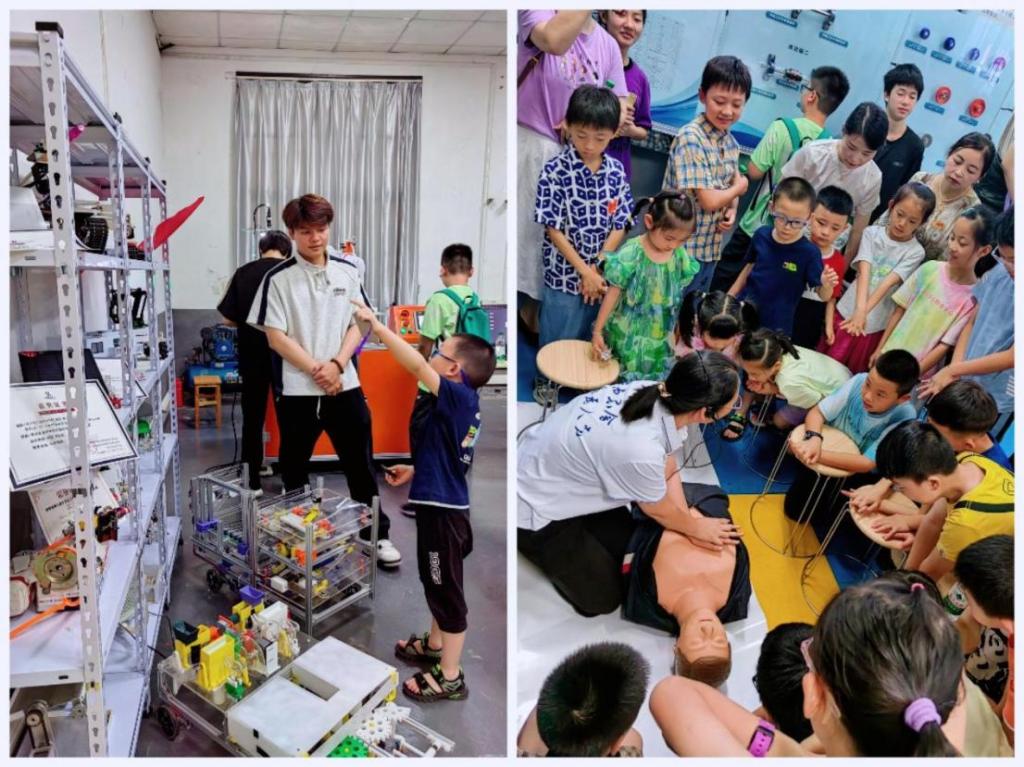本次活动包含数字化、智能化技术知识科普与科技制作体验两个环节。参与活动的教职工和孩子们一起,沿着科普线路,依次参观了英国上市公司365的智能制造实训室、现代钳工实训室和工程实践文化园。孩子们亲眼见证了机械手是如何将不同的饮料罐抓取后,精准地将罐中饮料倒入杯中;看到了机械传动机构是如何实现运转的,还学习了触电后该如何施救等科学知识。孩子们饶有兴趣地追问着老师和大学生哥哥们,科学的种子已然在他们幼小的心灵中悄悄地萌发出来……