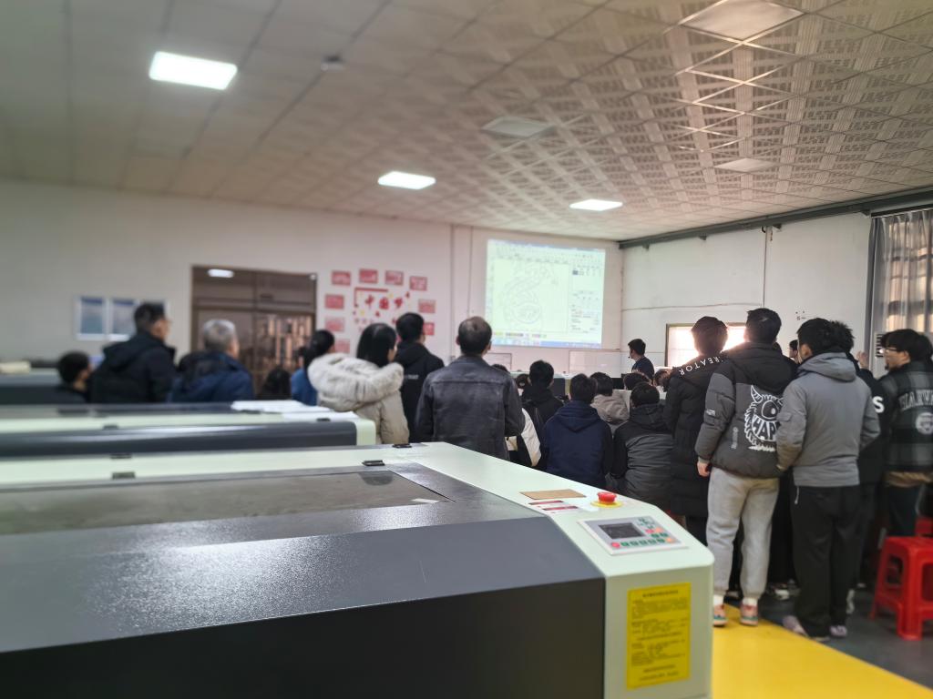 在激光雕切实训教学时,陈卓威老师从加工参数的设置入手,详细讲解了激光雕切加工的实操步骤,并对激光加工过程中可能出现的安全问题进行了强调和演示。课上,他鼓励学生们积极提问,课堂气氛十分活跃。