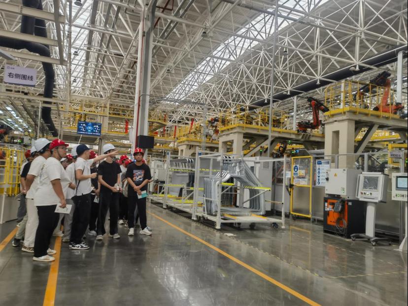 活动伊始,师生们依次走进高度自动化的激光焊接车间与复杂精密的总装车间。在激光焊接车间,工业机器人集群成为生产核心,负责人现场讲解:“这些机器人搭载了激光视觉跟踪系统,能够实时识别焊缝位置,确保每一道焊缝都能达标。”学生们认真聆听、仔细记录,深刻认识到机器人技术在焊接自动化与精密控制中的关键作用。