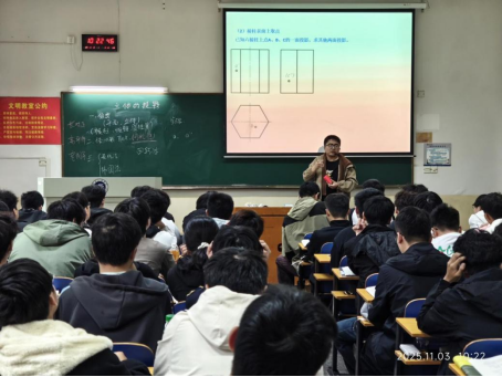 赵智航在《工程制图》课上针对立体的投影,系统讲解了平面立体、曲面立体等基本体视图的绘制方法,并现场演示了点在各个视图间的关系,通过“由物画图”和“由图想物”的双向训练,学生们在课堂中积极动手,尝试绘制圆柱、棱柱、圆锥等常见立体的三视图,课堂互动频繁,气氛活跃,学生的逻辑思维与空间思维得到显著培养。